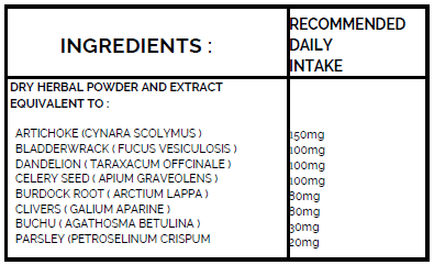 Ingredients: Artichoke, Bladderwrack, Dandelion, Celery Seed, Burdock Root, Clivers, Buchu, Parsley